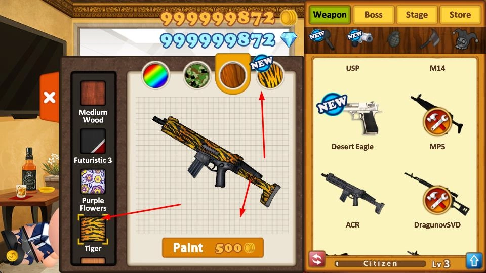 你可以在武器界面挑选Desert Eagle、MP5、ACR这类枪械,另外花500金币就能给枪械做涂装,打造出属于自己的专属武器。