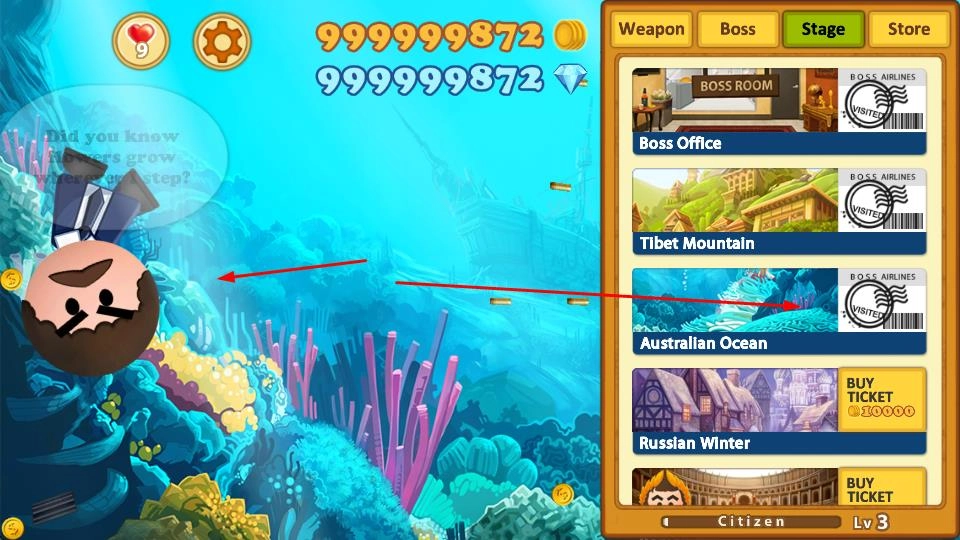 进入游戏场景后,操控武器与角色进行互动,角色会触发对应的台词回应,与此同时还能收集金币,助力游戏进程向前推进。