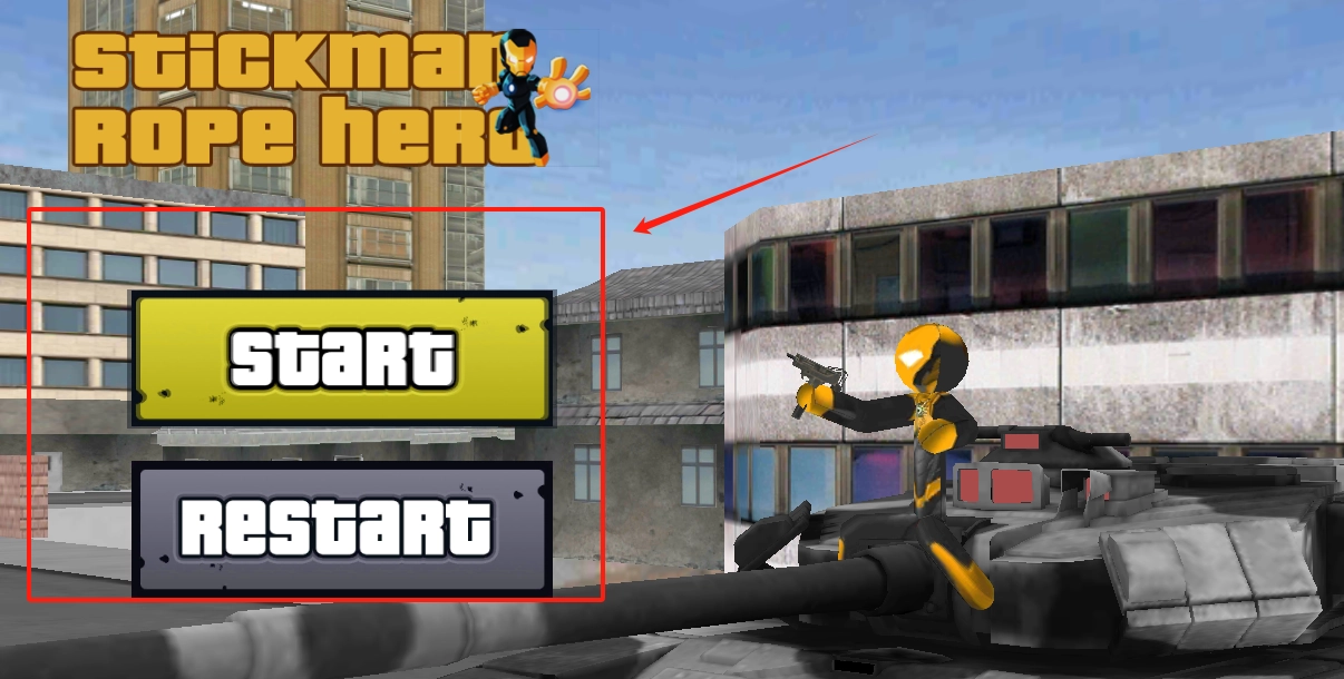 屏幕左上角显示着游戏名称,中间位置有两个按钮——黄色的START用于开始游戏,灰色的RESTART则是重新游玩的功能键,右上角的箭头正指向START按钮。