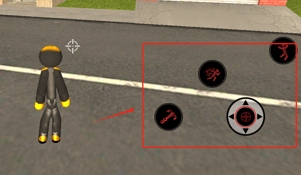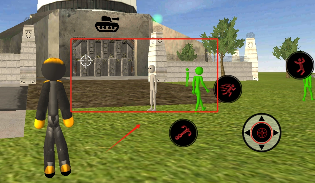 草地上站着人物,前面有带瞄准的门,右边白色火柴人站着,屏幕右下角有攻击、跑、瞄准的控制按钮。