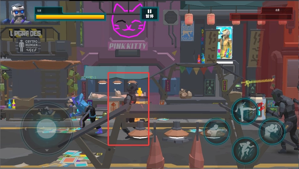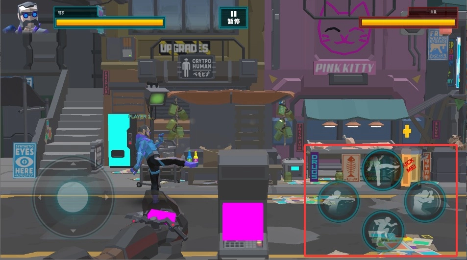 点击屏幕右侧的按钮可以打出直拳或者勾拳,连续快速出拳能够压制住对手,看准时机点击跳跃键可以躲避对手的重击。