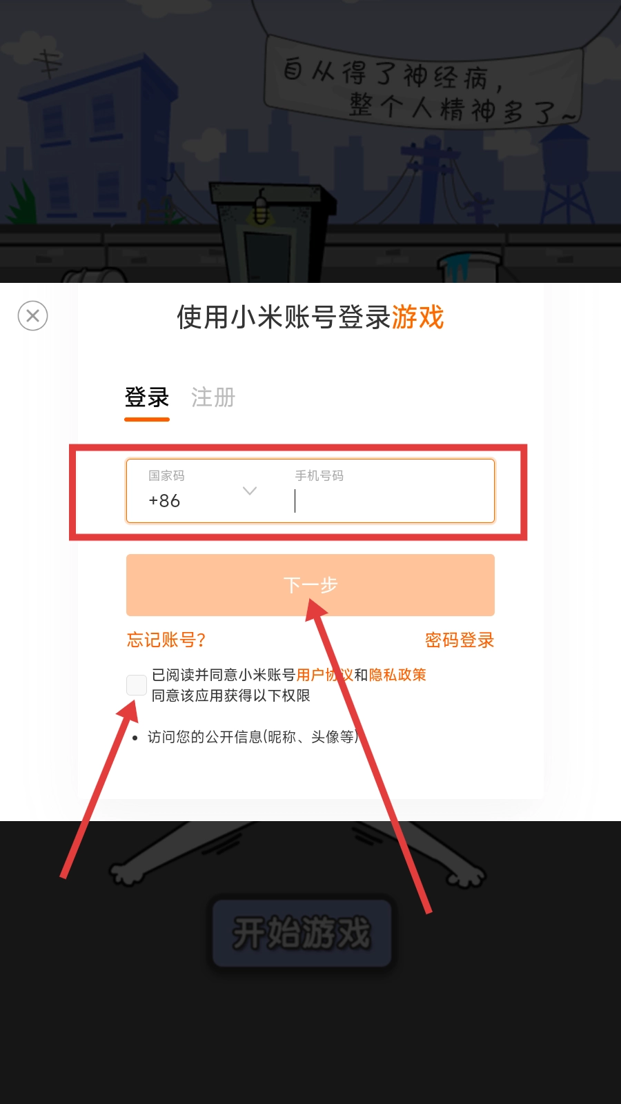 请输入手机号码,勾选同意用户协议后,点击【下一步】按钮以获取验证码。