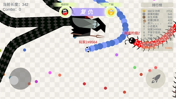 拖动摇杆来操控小蛇的行进方向,吃掉地图上那些彩色的小豆豆,小蛇就能不断变长。