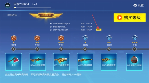在地图选择界面点击超级联赛,完成任务能领取段位经验,段位提升后可获得新武器。