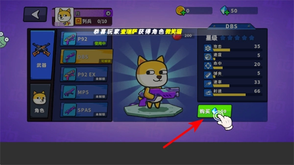 在角色界面中点击购买按钮,消耗相应数量的钻石(例如50钻石),即可解锁新角色黄色小狗。该新角色将附带专属属性与技能,从而丰富你的配置选择。