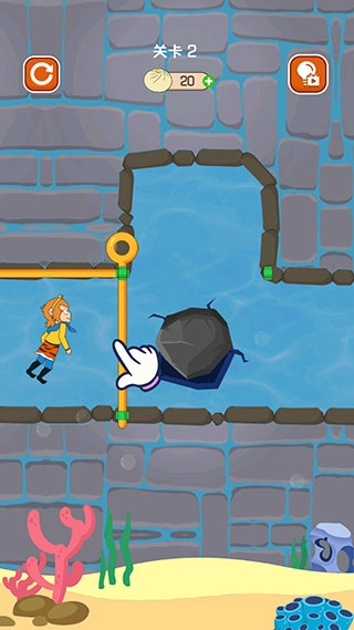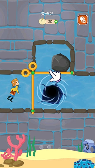 第二关得先把横向的拉杆拉开,这样石块就会掉下来把洞口堵住。