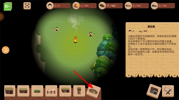 挑选采石场建筑,安置在适宜的山地区域,进行采石作业,获取石材资源,增加资源品类,为后续建筑工具的制作给予支撑。