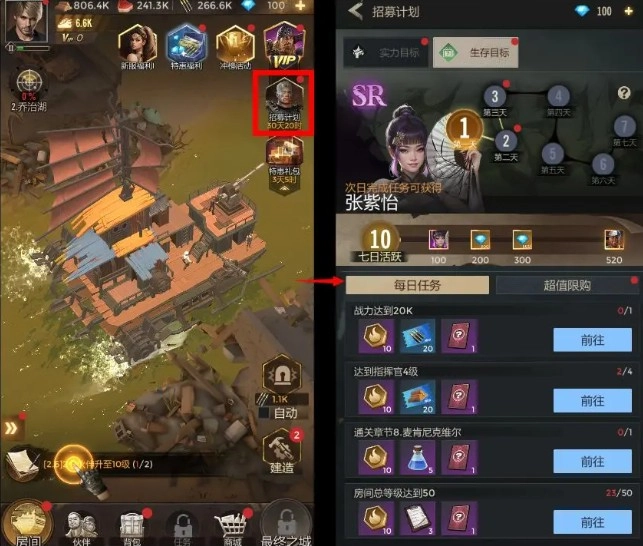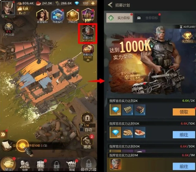 完成“招募计划”-“生存目标”里的每日指定任务来获取活跃点,就能得到丰厚的末日生存资源和钻石奖励哦~