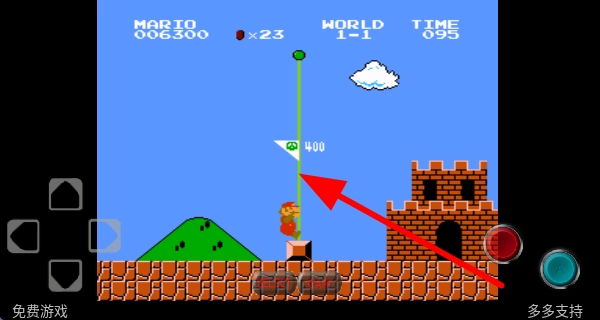 当遇到绿色的旗杆时,操控马里奥跳起来触碰它,不仅能得到分数奖励,还能向着关卡终点前进,从而完成当前这一关卡。