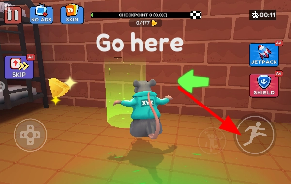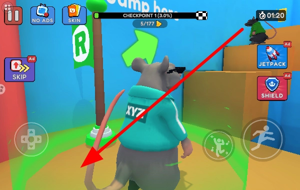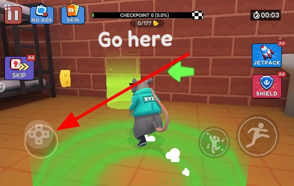使用左侧的操控按键来控制老鼠的移动方向,让它朝着带有Gohere提示的绿色区域行进,在场景中进行探索以寻找目标。