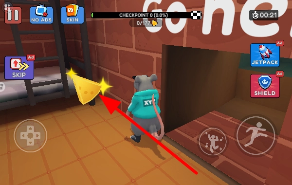 当看到黄色奶酪时,点击右侧的奔跑按钮,就能让老鼠快速移动过去获取;收集奶酪有助于推进关卡进度。