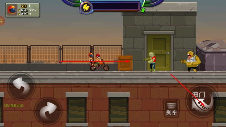 在游戏关卡里,你可以借助油门和刹车按键操控摩托前进,巧妙处理场景中出现的木箱、僵尸之类的障碍。