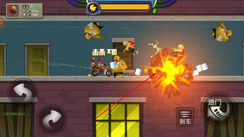 玩家可以驾驶摩托撞击僵尸,也能借助爆炸效果消灭敌人,通过积累击杀数,努力提升关卡得分。