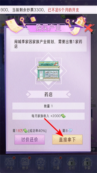 在游戏里点击“直接拿下”按钮,就能购买像药店这类产业,这是积累家族财富的重要操作,购买时要留意产业的收益情况和成功概率。