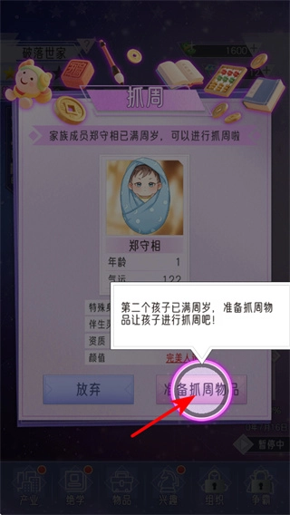 点击准备抓周物品按钮,即可开启家族成员的抓周仪式。这是对家族成员发展具有核心影响的操作,进行该操作时需挑选合适的抓周物品。