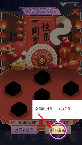 点击精心准备按钮,能够提升抓周物品的品质,这是优化抓周效果的关键环节,准备过程中要留意物品品质给家族成员带来的影响。