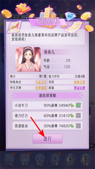 点击该按钮,即可执行像“小试牛刀”这类商机策略,这是获取家族资源的核心方式,需要依据策略的成功率与收益情况来挑选适宜的方案。