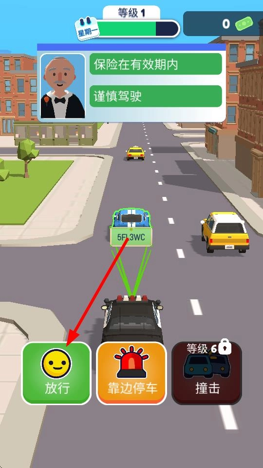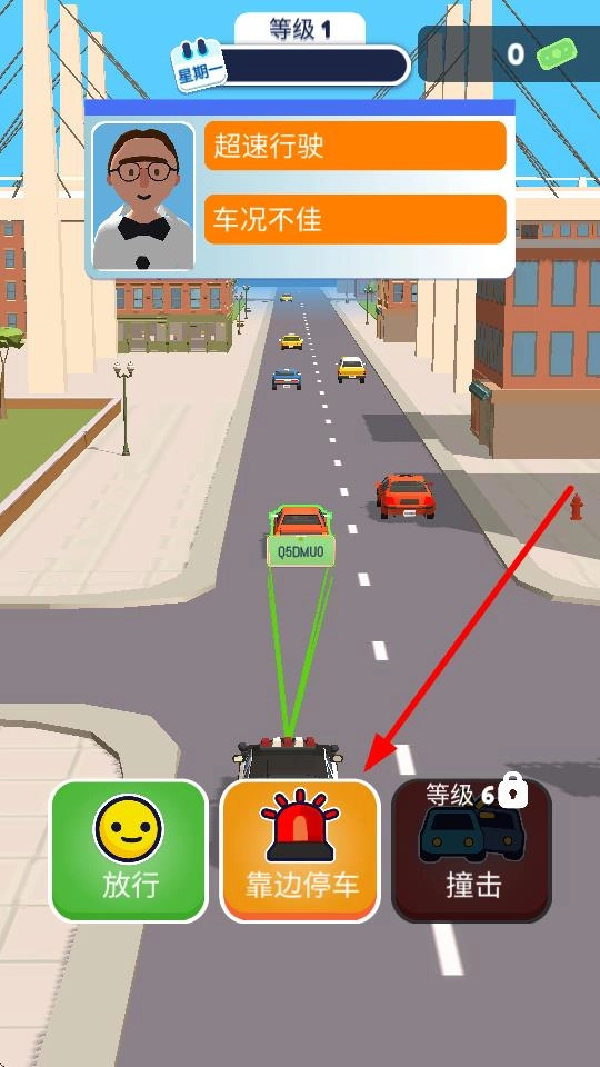 警车操控与激光扫描:通过滑动屏幕左右两侧来控制警车的移动,在移动的过程中会触发黄色激光线,把激光线准确地照射到过往车辆上,从而完成对车牌、车速以及行驶状态的违规检测。
