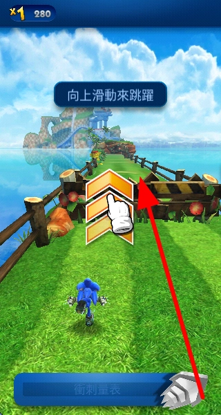 当遇到需要跨越的障碍时,向上滑动屏幕,索尼克就会跳起,越过障碍,继续前进,努力跑得更远。