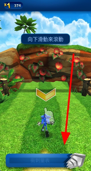 当遇到前方的低矮通道时,只需向下滑动屏幕,索尼克就会蜷缩成滚动状态,顺利穿过通道以避开碰撞,继续朝着目标方向前进。