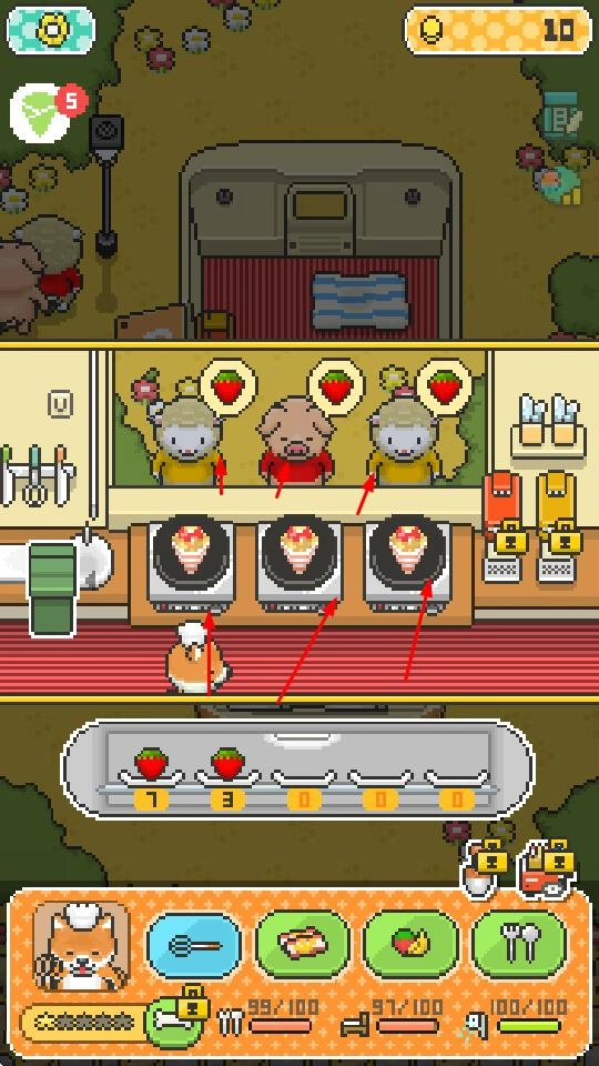在店铺界面,把做好的料理递给顾客,满足他们的需求,以此获得游戏奖励,推动游戏继续进行。