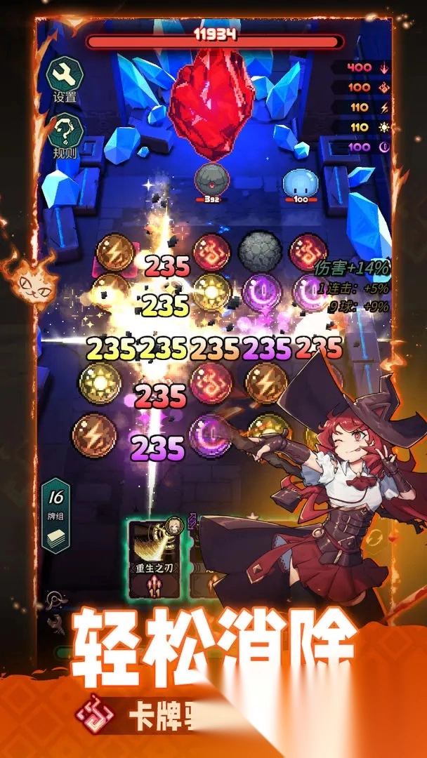 这款游戏把卡牌策略和三消元素结合在了一起,玩家要把卡牌拖到元素球所在的区域,松开手就能放出技能。