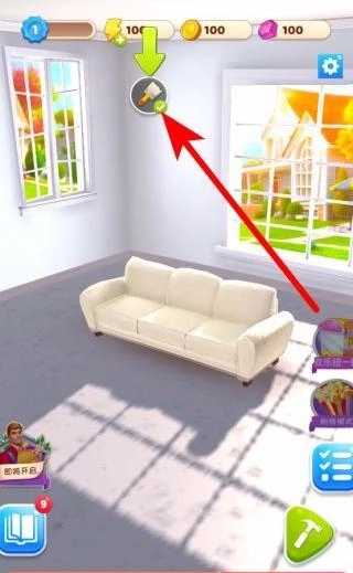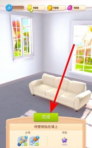 在备齐装修要用的工具后,回到装修界面,找到并点击对应的操作按钮,比如贴壁纸对应的工具图标,以此来完成墙面装饰;等操作结束后,点击完成按钮,就能继续推进装修的进度了。