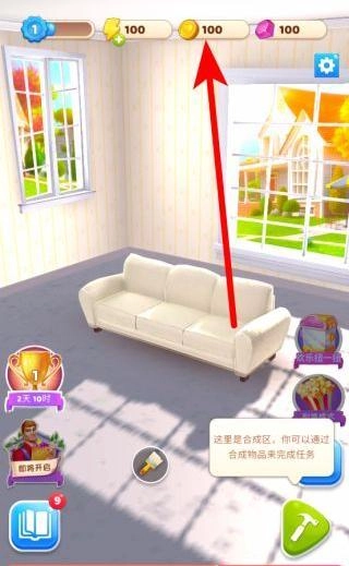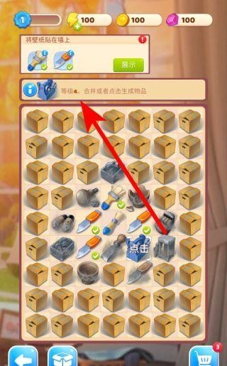 进入游戏后,首先查看装修任务,例如给墙面贴壁纸这类任务需要特定工具,这时就要进入合成区,通过合并或点击的方式生成所需工具,为后续的装修工作做好准备。