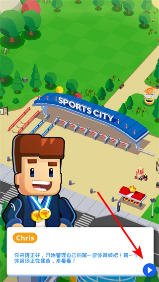 点击界面右下角的蓝色箭头按钮,跟着Chris的指引,开启你的体育城管理之旅吧,这是熟悉游戏基本操作的第一步。
