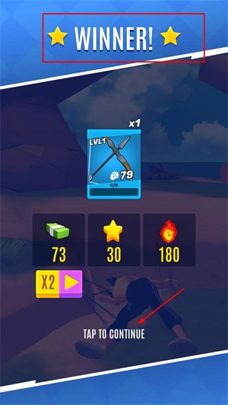 获胜之后界面会显示WINNER,能得到73金钱、30星星和180火焰的奖励,点击底部的TAP TO CONTINUE就可以继续游戏。
