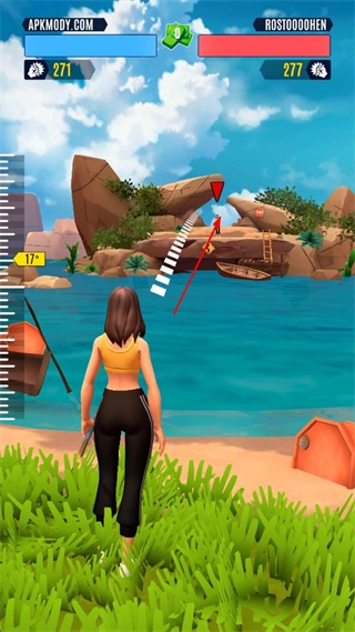 在游戏里把左侧的角度刻度调整到合适的位置,对准远处的对手,按照提示发射武器,此时界面上显示双方的生命值都是271。