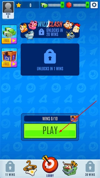 进入软件主界面后,点击绿色的PLAY按钮即可开始游戏。界面上会显示需要累计获得10场胜利,达成后不仅能解锁奖励,还可以领取免费道具。
