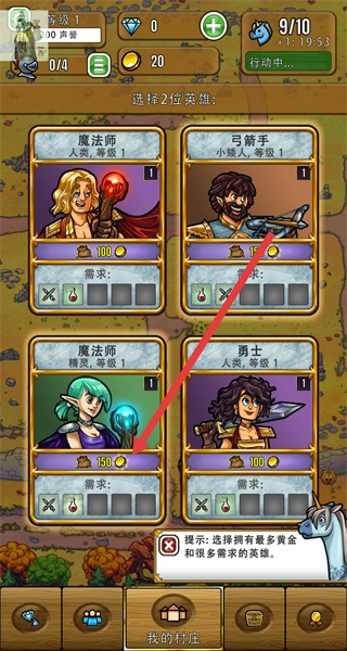 在英雄选择界面,根据提示选出黄金持有量最多且需求较大的英雄,通过招待该英雄来推动商品消费。