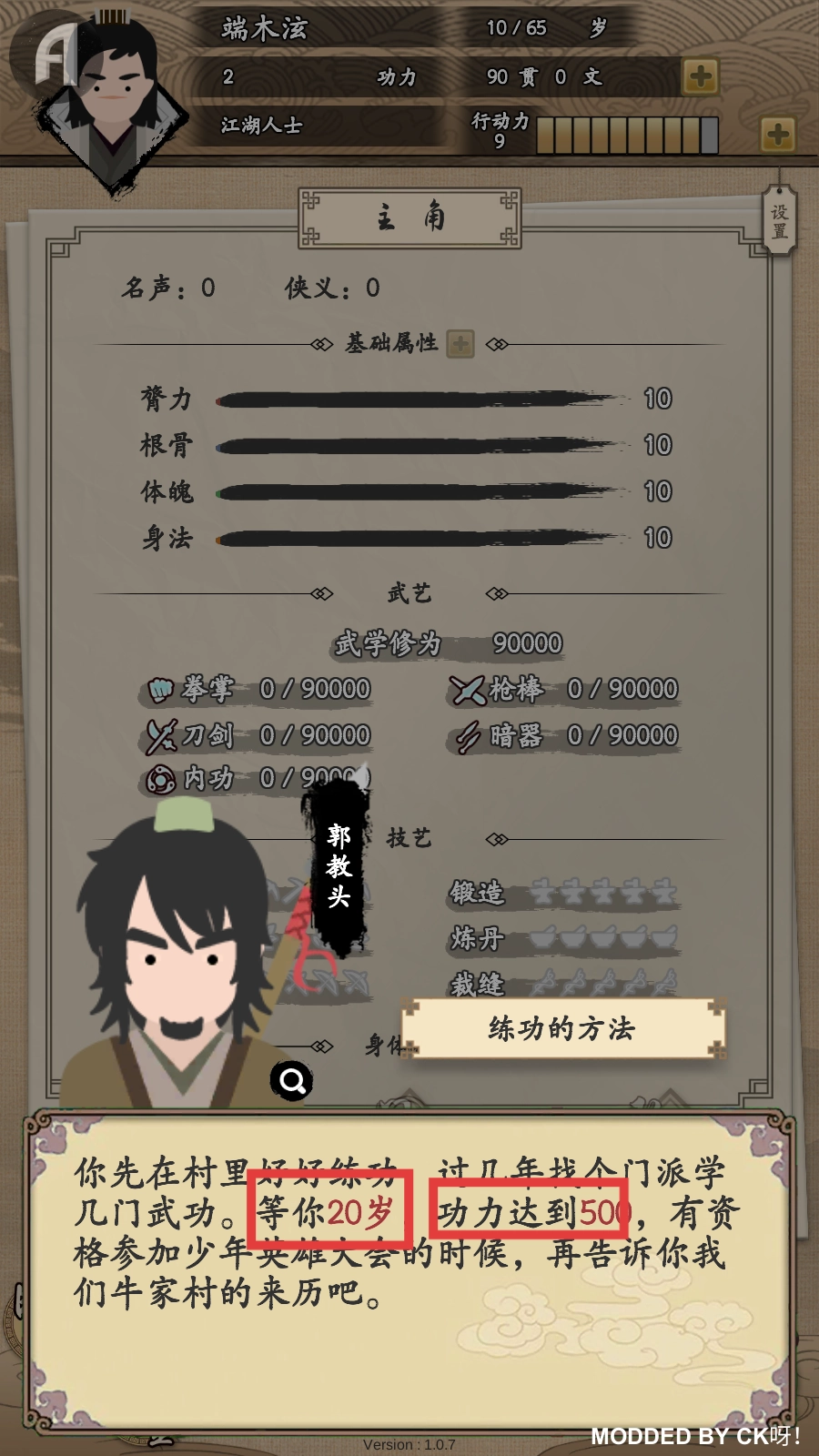 按照郭教头的指点,在村里专心练功,争取到【20岁】时【功力达到500】,好去参加少年英雄大会。