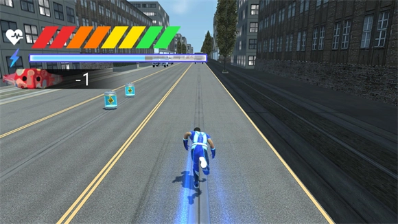 开始跑酷后,左上角会显示你的血条、能量和正义值,每撞倒一辆车都会扣血,跑得越远分数就越高。