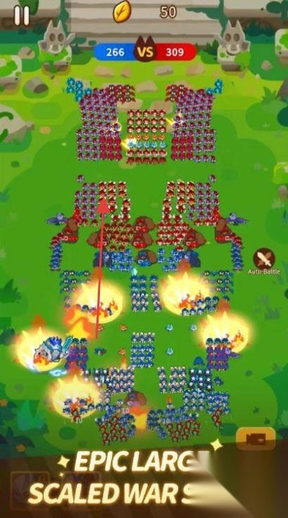 战斗的时候,打开自动战斗功能,部队就会依照阵型向敌方发起进攻,借助技能和数量上的优势来赢得胜利,进而推进关卡进度。