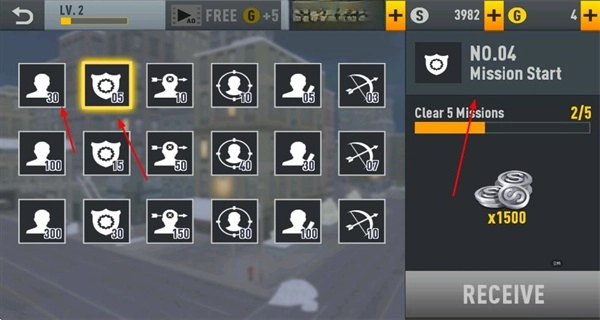 完成任务后点击RECEIVE领取奖励,所获资源可用于后续武器升级及关卡挑战的准备工作。