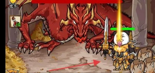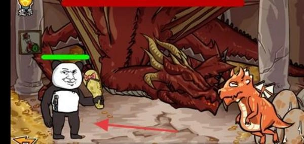 战斗操作:操控熊猫角色(持剑/拖鞋),攻击红色巨龙。