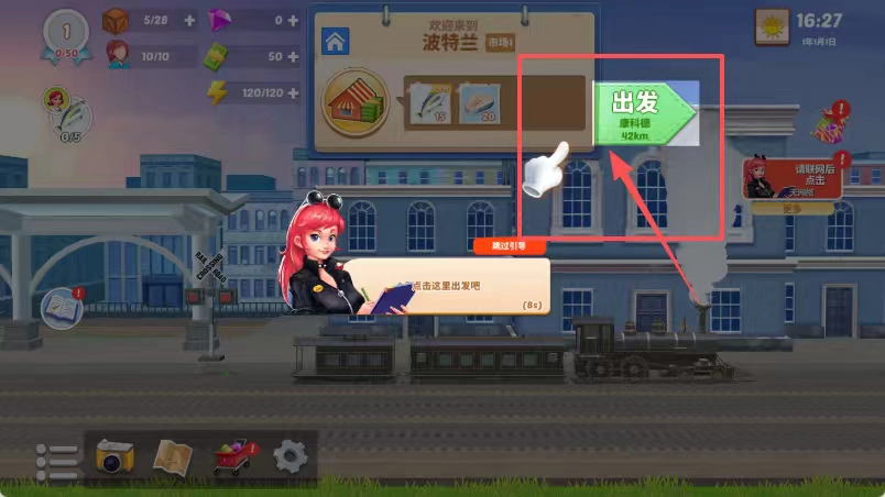 看红发女孩的界面图,点击浅橙色提示框旁边绿色的出发按钮,或者留意白色手指图标所指向的康科德出发键。