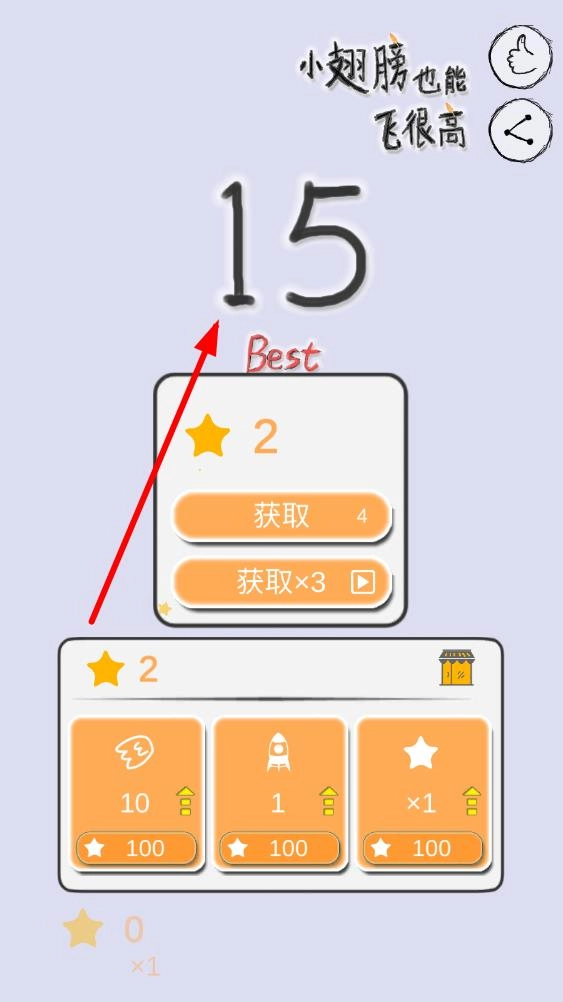 飞行结束后,留意箭头所指的分数及其他数据,点击下方按钮即可领取奖励,这些奖励可用于增强小鸟的飞行能力,为下一次挑战做好准备。