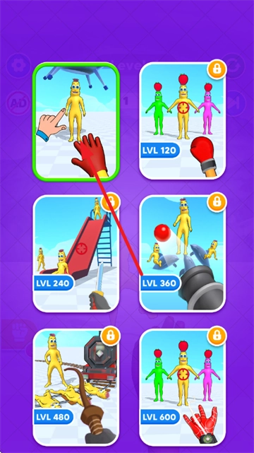 点击第一关即可开启游戏,进入游戏后能看到布娃娃以及可供选择的武器,你可以根据自身需求挑选合适的武器,为接下来的攻击做好准备。