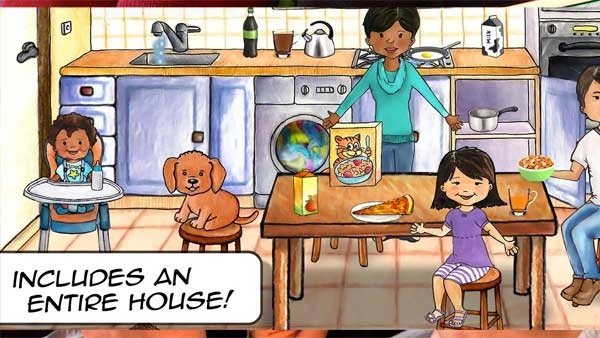 孩子能够自由探索房屋里的每一处角落,和所有物品展开互动,角色可以完成吃饭、睡觉、洗澡、刷牙之类的日常生活动作。