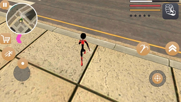 基础操作布局清晰明了,左侧区域用于控制角色移动与加速,右侧则集成了绳索、攻击和跳跃功能,右上角实时呈现武器切换选项、血量状态以及经验条。玩家能够自由探索城市地图,与敌对帮派展开交火。消灭敌人可以获得经验值,经验累积到一定程度会提升通缉星级,进而引来警察和其他NPC的联合围剿。在激烈的对抗中如何生存下来并达成目标,完全取决于玩家的个人策略与操作技巧。