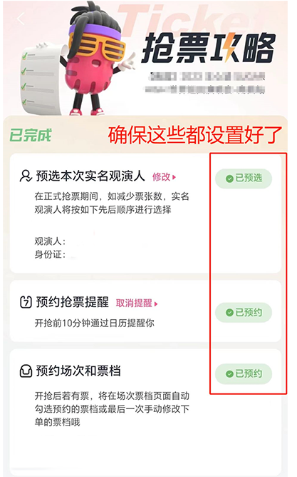 1、在演唱会开票前点击"添加日历提醒"和“抢票攻略”的提示,进入“抢票攻略”这个提示,提前选好观演人。可设置多个观演人,同一个订单优先连座。(一个订单可抢多人门票,提前设置多个观演人,可以购买多人连座门票)