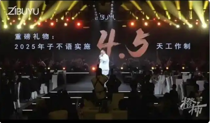 子不语集团近日在其年会上,CEO陈才雄进行了一场7分钟的演讲。在演讲的最后,陈才雄宣布公司将于2025年实施4.5天工作制,并在大屏幕上显示出“2025年子不语实施4.5天工作制”的字样,现场气氛顿时高涨,员工们纷纷表示激动和期待。
