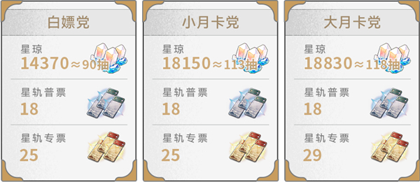 月卡玩家:大约获得20,260星琼,约127次抽卡。