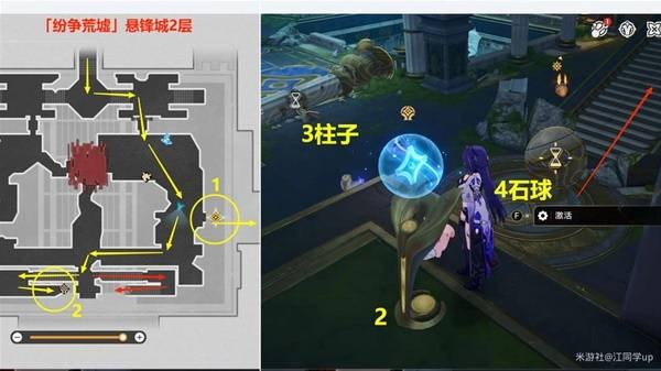 接下来,前往下方2层的4号石球位置,将其左侧的6号基座打碎,使得上面的石球滚到1层的7号位置。