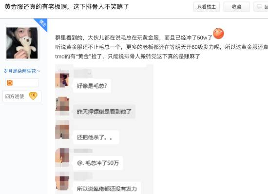 事实也的确如此,官方在开服前发布一份“神豪入驻名单”为玩家定心,而在开服后,据前线知情玩家传回的消息,“毛小毛”这些游戏大佬已经在黄金服消费了几十上百万,稳定飙升的金价已经让部分人尝到了甜头,两天赚了几千块,馋得大批围观玩家立马赶去黄金服分一杯羹。