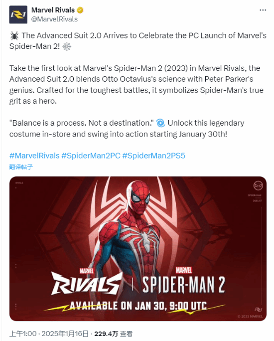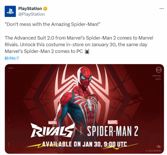 PS和《漫威争锋》官方推特共同宣布了这一消息,预计这款全新外观将于1月30日加入《漫威争锋》,值得一提的是,当天也是《漫威蜘蛛侠2》登陆PC平台的日子。
