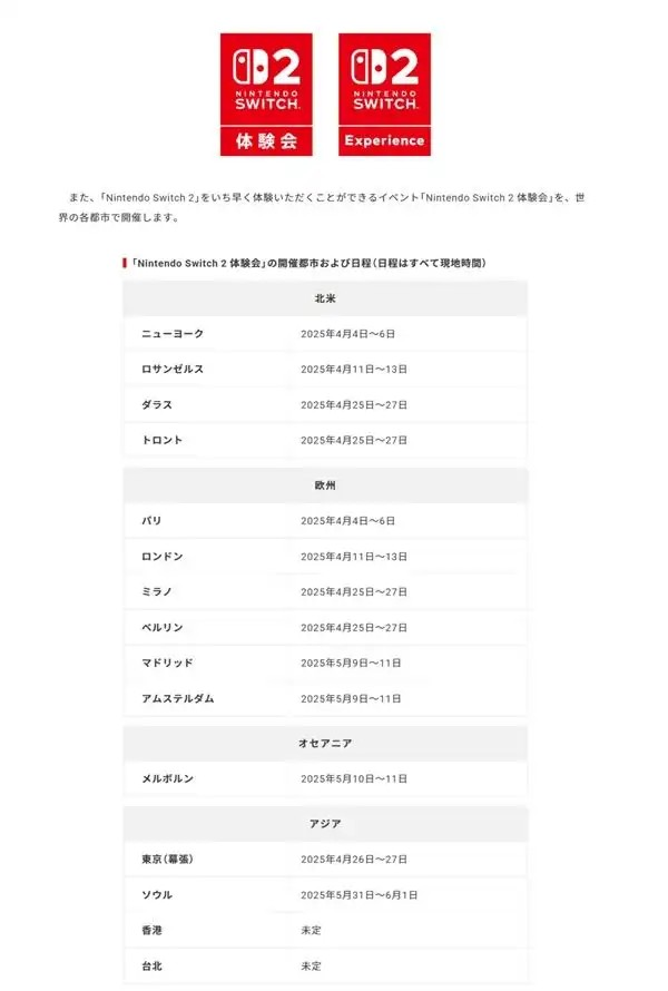 随后,任天堂将于4月4日开始在全球15座城市举办Switch 2体验会,其中包括中国香港和中国台北。